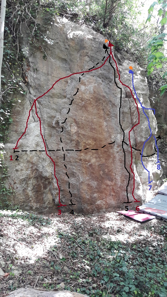 Dank Gerald, der links des Mittelsektors am Riveufer schon den Efeu zur Seite gelegt und einen ersten Boulder erstbegangen hatte, bin ich auf eine schöne leicht überhängende Boulderwand aufmerksam geworden und habe fleißig weitergearbeitet. Allein für diesen kleinen Abschnitt waren 4 h Putzarbeit nötig, so dass ich an dieser Stelle allen, die bisher in den großen Wänden Erschließerarbeit geleistet haben, noch einmal meinen allerherzlichsten Dank und Respekt aussprechen möchte. Es ist eine Schweinearbeit, die sich aber, dessen bin ich ganz sicher, über die Jahre auszahlen wird. Der neue Bouldersektor "RIVERA" ist wandttechnisch fertig, in den Randbereichen krümelt es noch etwas, aber das sollte mit der Zeit besser werden. Die Zielhenkel sind großzügig freigelegt, aber es rutscht dennoch noch hin und wieder Erde nach, so dass ich im Verlauf mal abseilend mit dem Spaten antreten werde. Es macht aber keinen Sinn, mit dem Klettern noch so lange zu warten. Die Wand ist relativ hoch, das Absprunggelände gut und vom Müll beräumt; zwei Pads gereichen dennoch zum Vorteil. Mein Topo ist nicht annähernd so schick wie die aus dem Hause Geoquest, sollte aber zur Orientierung reichen. (Trotz ausreichender Bierzufuhr hatte ich beim Zeichnen mit der Maus keine ruhige Hand.