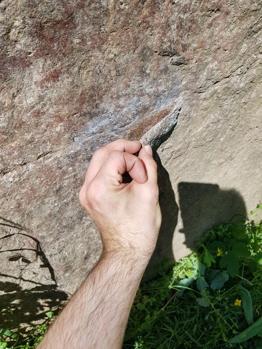 Vom Charakter der Tour bin ich sehr angetan. Extrem technische old-school-Kletterei in senkrechter Wand, wo alle Bewegungen ziemlich präzise ausgeführt werden müssen und die Sequenz und Micro-Beta gut sitzen muss. Enge Schuhe ohne zuviel Downturn sollten hier von Vorteil sein; mit den gemütlichen alten Tretern biegt es jedenfalls immer die Kante hoch und man rutscht von den Tritten. Schmerzresistente Fingerkuppen und gute Haut schaden auch nicht.