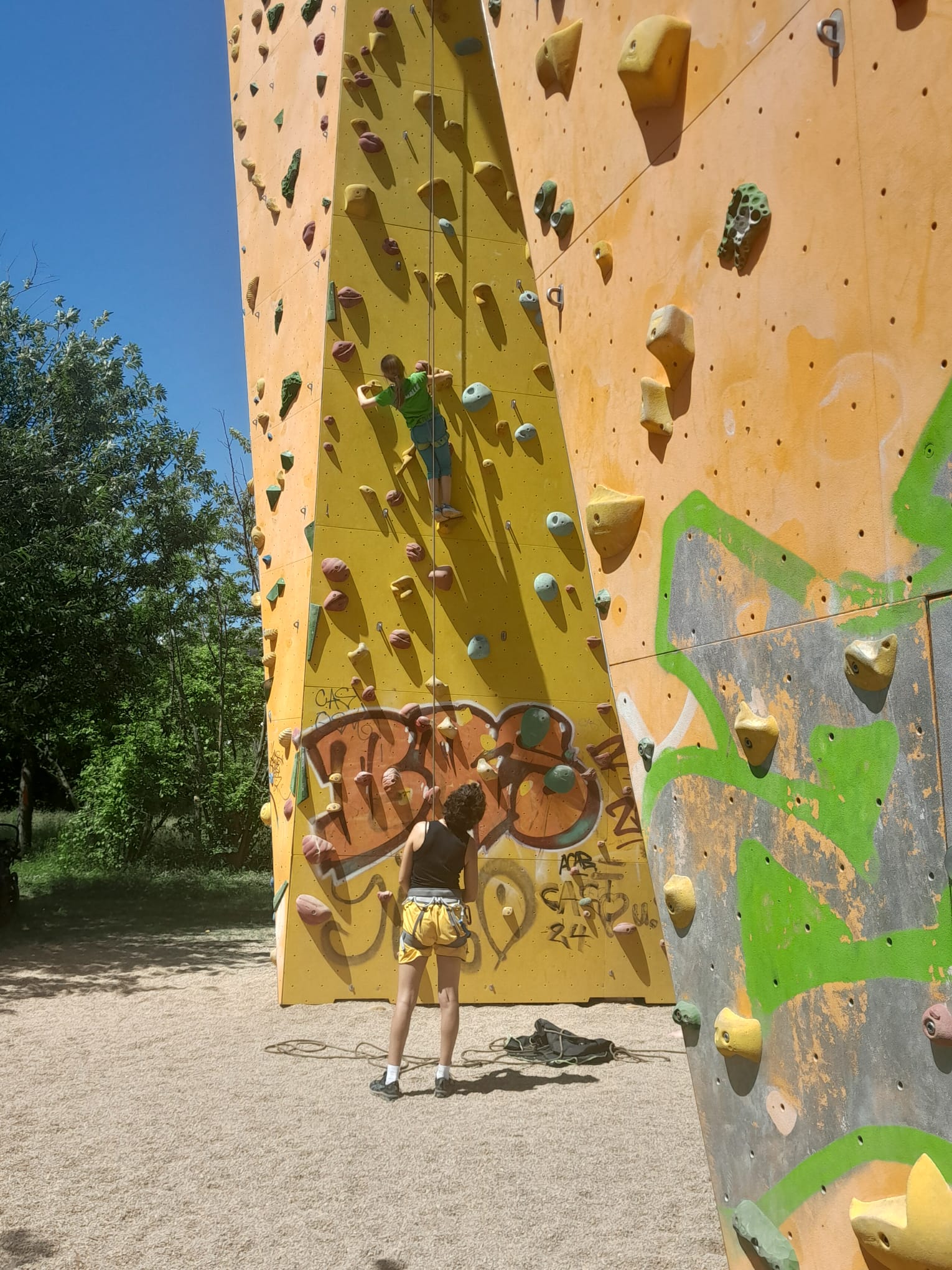 Am 14. Juni 2025 gab es die Möglichkeit, am IG Kletterturm am Thüringer Bahnhof unter fachkundiger Anleitung der Klettertrainer*innen des Vereins bis ganz nach oben zu steigen. Nach einer spielerischen Erwärmung konnten alle Mutigen mit einem Seil gesichert erste Klettererfahrungen sammeln.